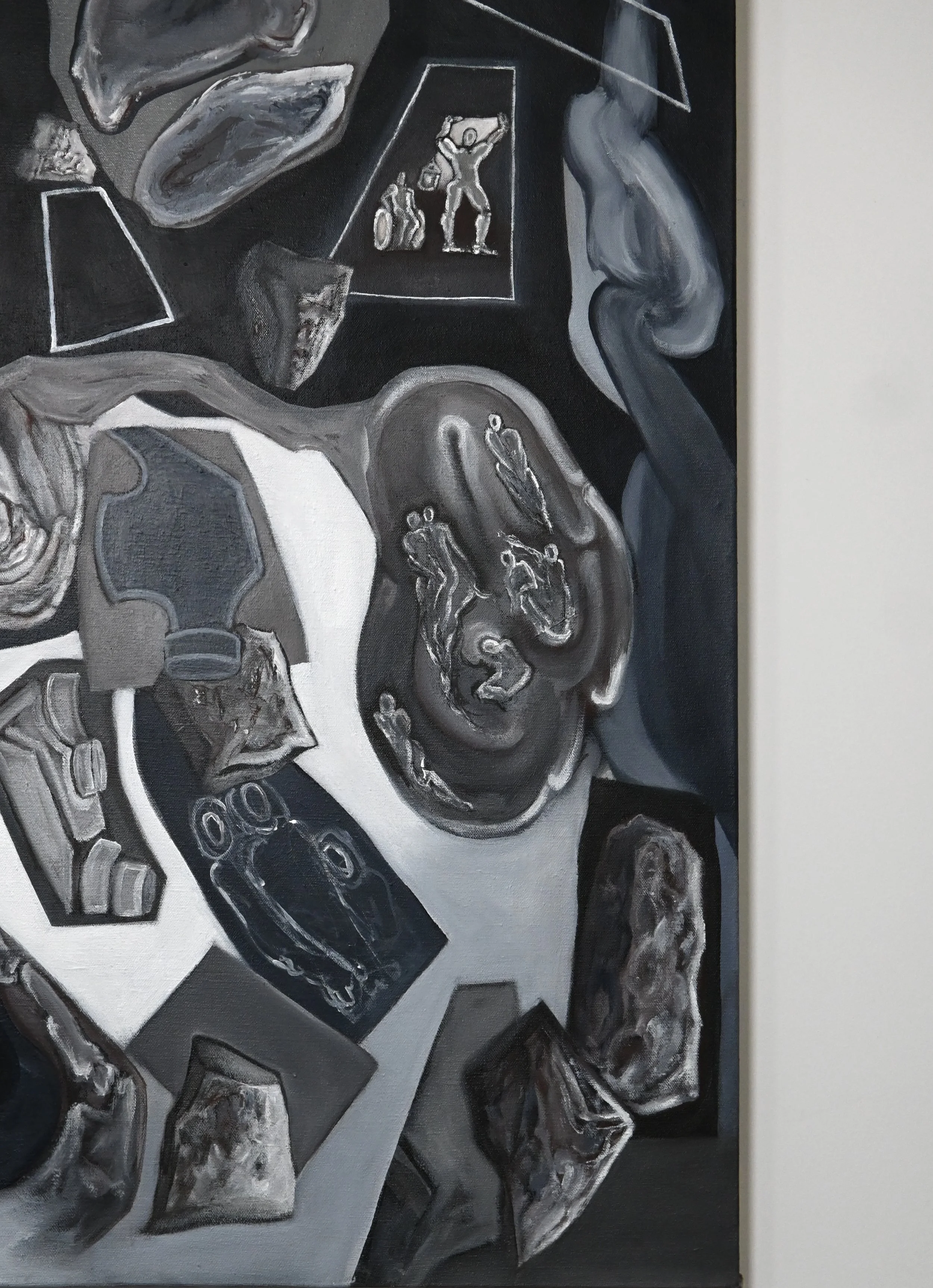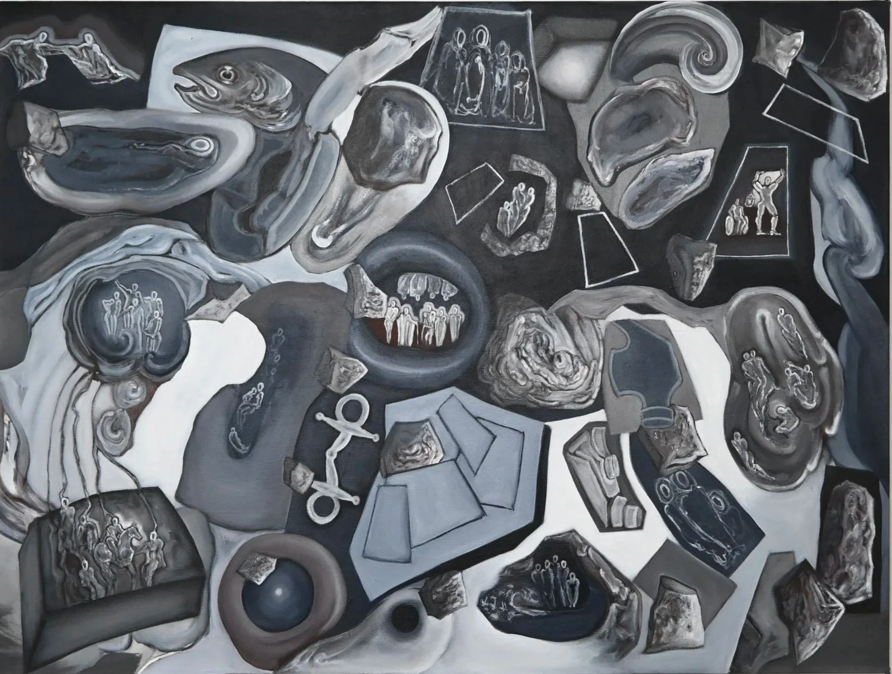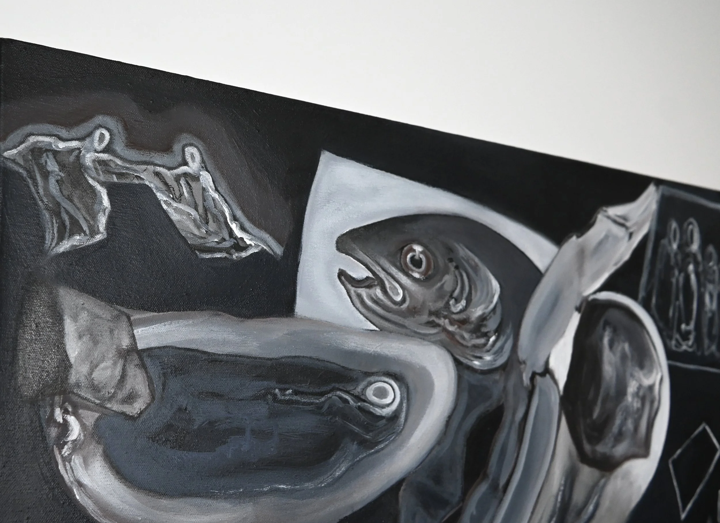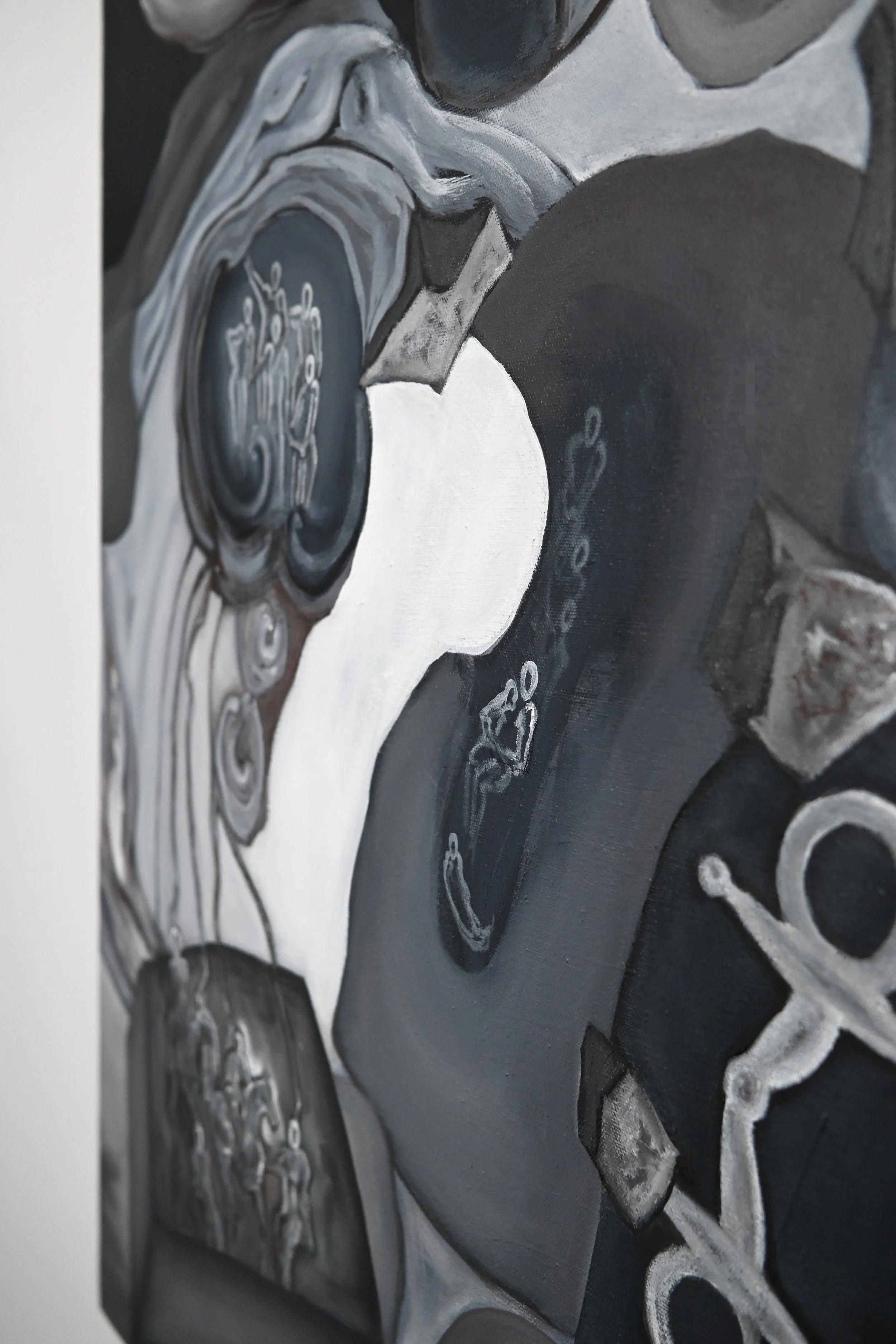 rehydrated acrylic, India ink and conte on upcycled canvas