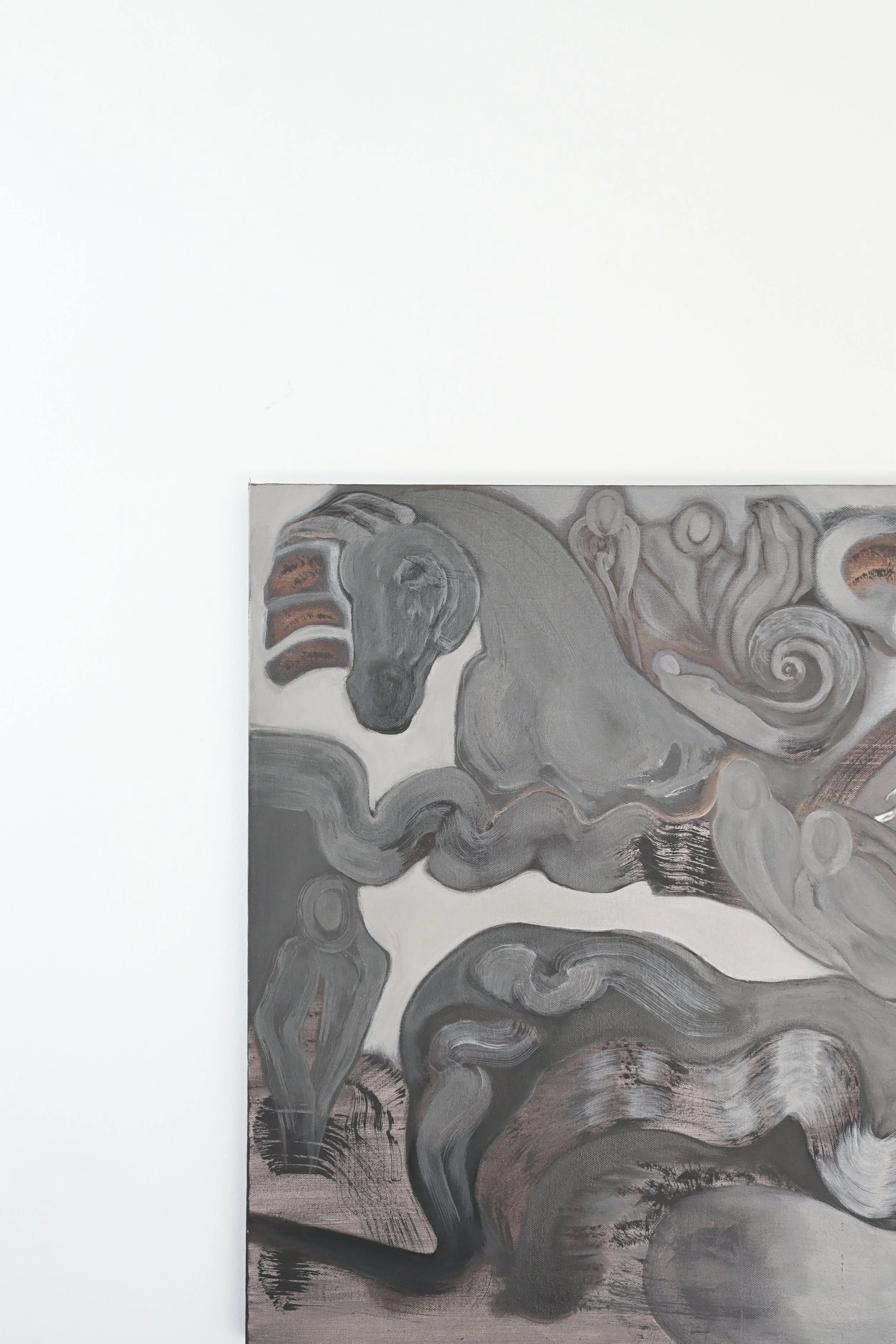 a private commission, this work features a blacktail doe, brown trout and gelding in a coastal environment surrounded by Mikell’s identifiable figurative motifs.